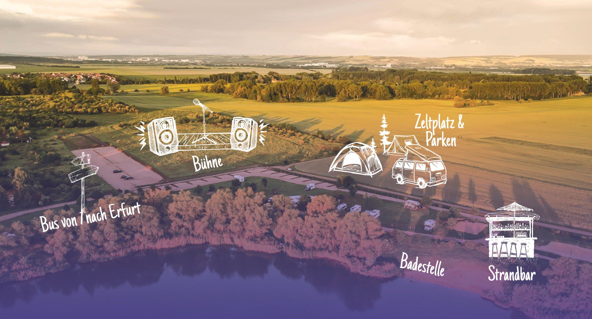 Hier findest du unseren Lageplan mit allen wichtigen Punkten – von Bühne über Campingplatz bis zum Parkplatz. Alles ist schön kompakt, die Wege kurz, der See und die Strandbar immer in Reichweite. Du wirst dich schnell zurechtfinden – versprochen.
