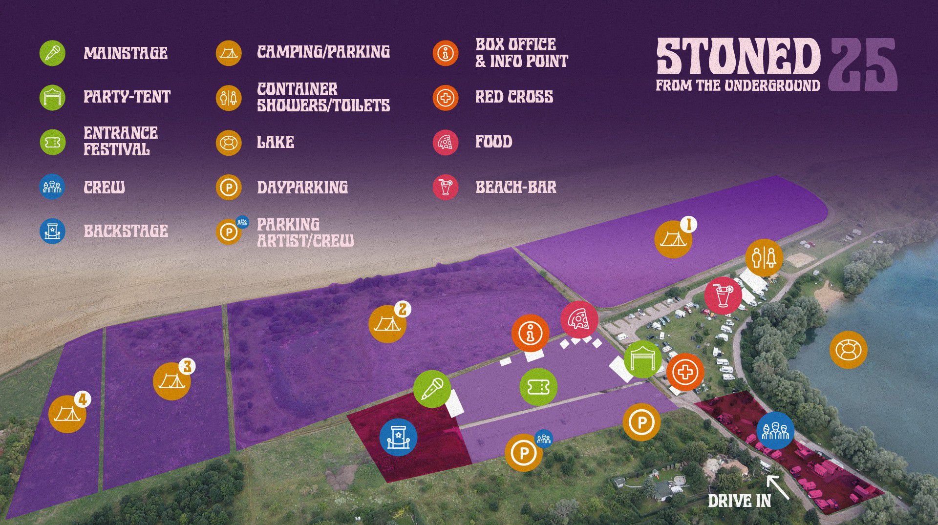 Hier findest du unseren Lageplan mit allen wichtigen Punkten – von Bühne über Campingplatz bis zum Parkplatz. Alles ist schön kompakt, die Wege kurz, der See und die Strandbar immer in Reichweite. Du wirst dich schnell zurechtfinden – versprochen.